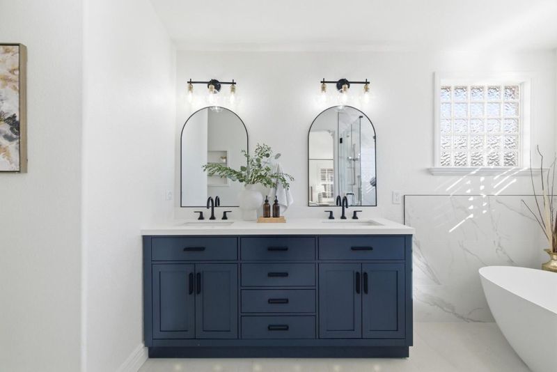 - Double Sinks, Full on Ground Floor, Granite, Marble, Pass Through, Primary - Oversized Tub, Primary - Stall Shower(s), Tub in Primary Bedroom, Updated Bath