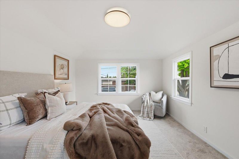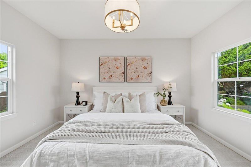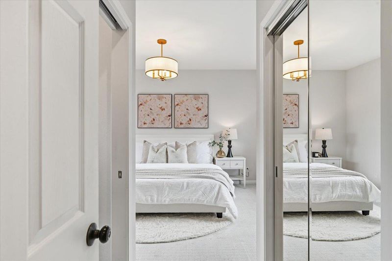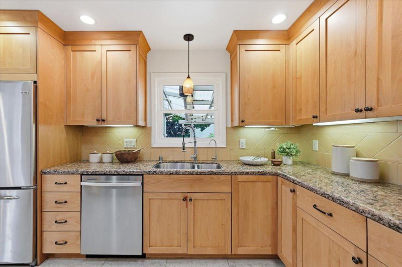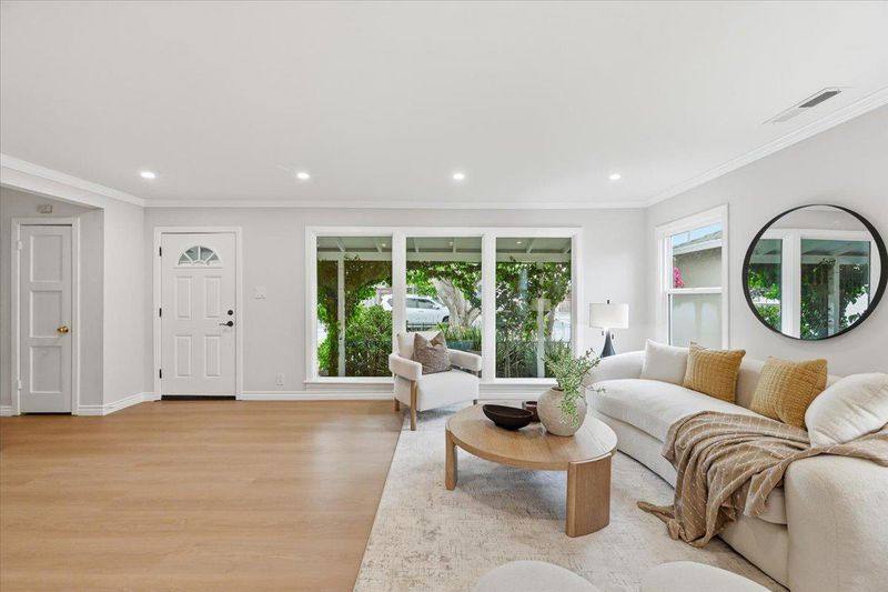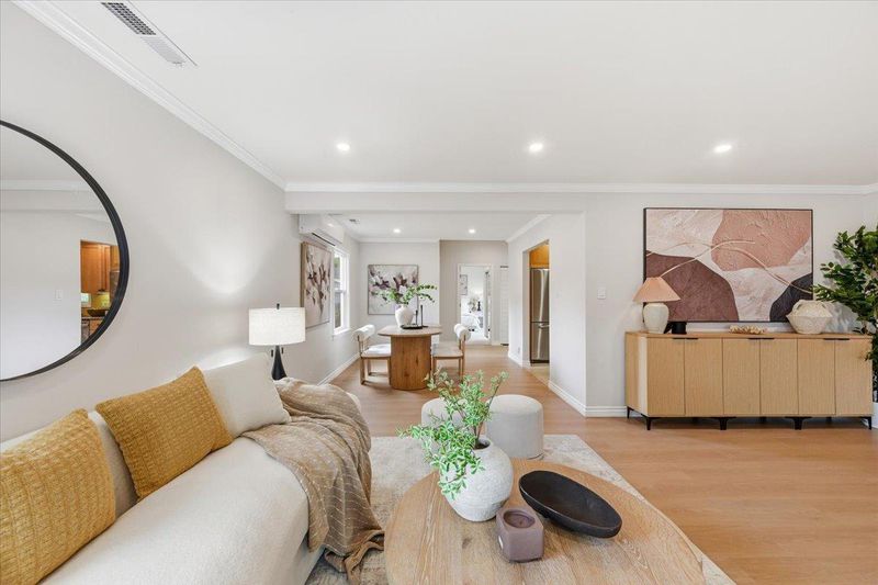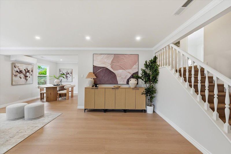 Thoughtfully upgraded and meticulously maintained by its original owners, this stylish PUD blends modern design with everyday comfort. A welcoming private courtyard features wood-style paver surfaces, creating a warm and cohesive outdoor setting that extends to the backyard. Inside, engineered wood flooring runs throughout, complemented by a refined black-accent design from sleek black cabinetry and a high-powered range hood to the staircase railing creating a cohesive, designer-inspired look. The bright living room offers a cozy wood-burning fireplace and abundant natural light, while the separate family and dining areas open to the backyard. The upgraded kitchen features black cabinetry, stainless steel appliances, a gas range, and a large double-door refrigerator. Both bathrooms have been tastefully remodeled. The main level includes a bedroom and a full bathroom, ideal for guests. Upstairs, two well-sized bedrooms share an updated bathroom. The backyard features a blooming tree and opens directly to a lush, park-like greenbelt, offering the feel of an extended private outdoor space. Located in a quiet court, this home is served by top-rated Los Altos High School. Within 10-20 min to major Silicon Valley tech campuses. Close to parks, shopping, and downtown Mountain View.