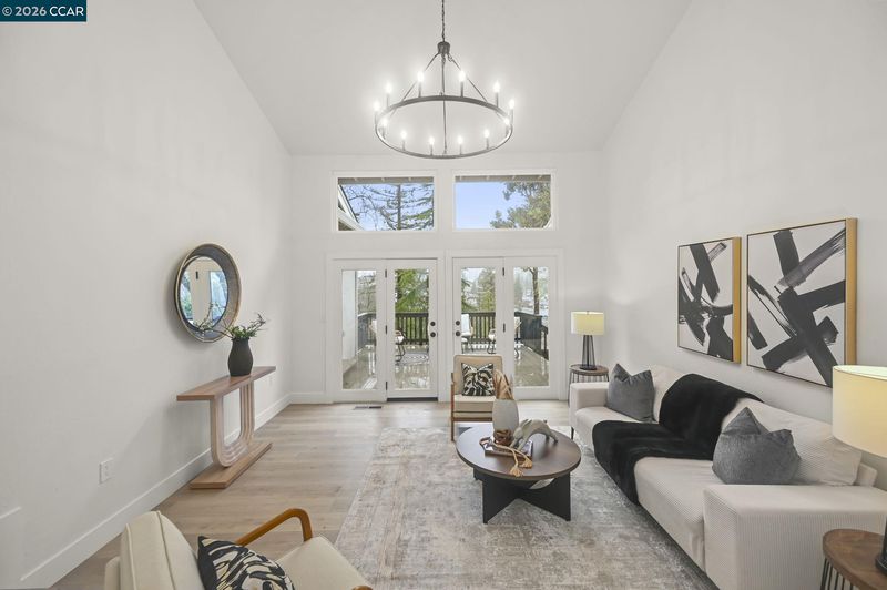 Experience elevated living in this beautifully updated Virginia Hills home on the Pleasant Hill–Lafayette border. Scenic hillside views greet you the moment you enter. Soaring vaulted ceilings and light oak wood-look flooring enhance the inviting living room, which opens to expansive decks showcasing the serene backdrop. The spacious dining room features a garden-style window and statement chandelier, perfect for memorable gatherings. The updated kitchen shines with crisp white cabinetry, quartz counters, breakfast bar seating, and new GE gas range and dishwasher, flowing seamlessly into the family room with a classic brick fireplace and easy deck access for ideal indoor-outdoor living. Outside, multiple decks and patios, a grassy lawn framed by pine and redwood trees, and space for gardening or play create a private retreat. The primary suite offers dual vanities and two closets, while three additional bedrooms share a remodeled bath. Indoor laundry and a garage with epoxy floors and loft storage complete the home. Close to shopping, schools, trails, and dining. A must see.