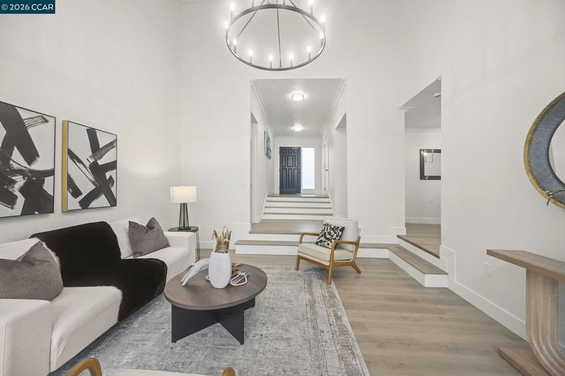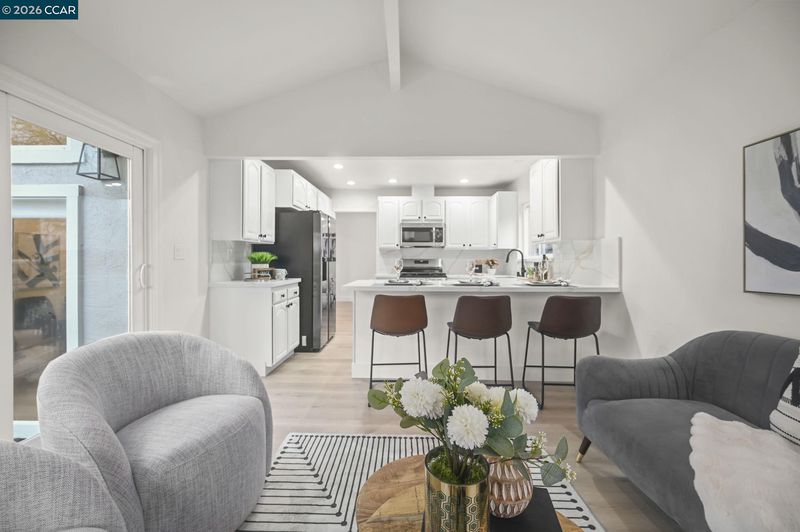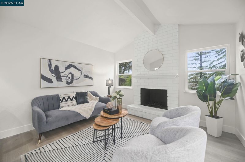 Experience elevated living in this beautifully updated Virginia Hills home on the Pleasant Hill–Lafayette border. Scenic hillside views greet you the moment you enter. Soaring vaulted ceilings and light oak wood-look flooring enhance the inviting living room, which opens to expansive decks showcasing the serene backdrop. The spacious dining room features a garden-style window and statement chandelier, perfect for memorable gatherings. The updated kitchen shines with crisp white cabinetry, quartz counters, breakfast bar seating, and new GE gas range and dishwasher, flowing seamlessly into the family room with a classic brick fireplace and easy deck access for ideal indoor-outdoor living. Outside, multiple decks and patios, a grassy lawn framed by pine and redwood trees, and space for gardening or play create a private retreat. The primary suite offers dual vanities and two closets, while three additional bedrooms share a remodeled bath. Indoor laundry and a garage with epoxy floors and loft storage complete th