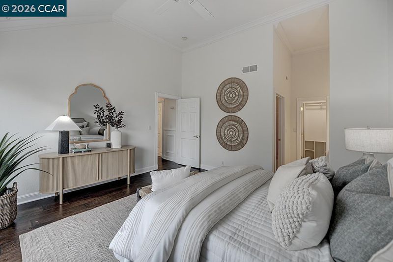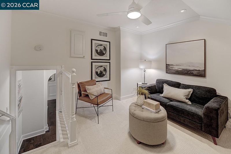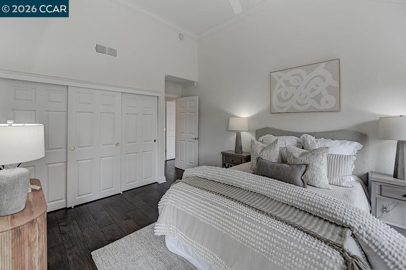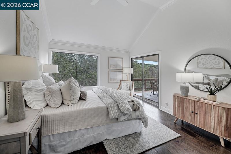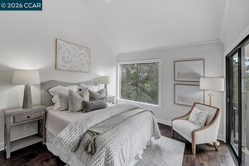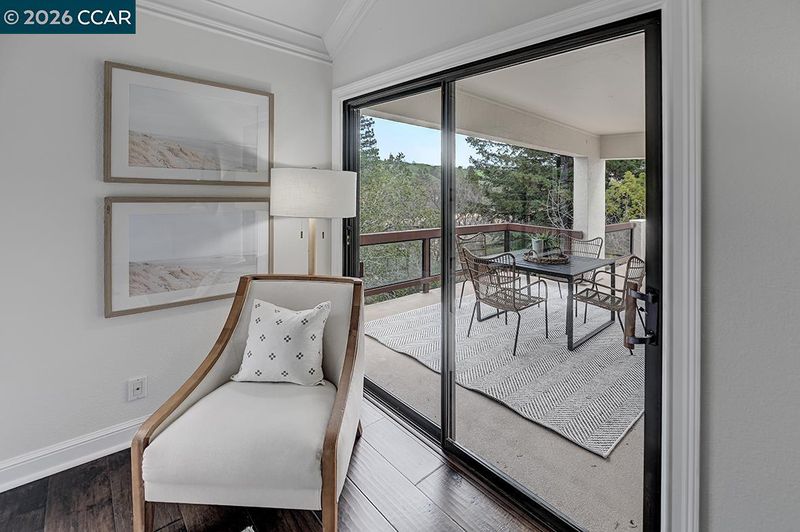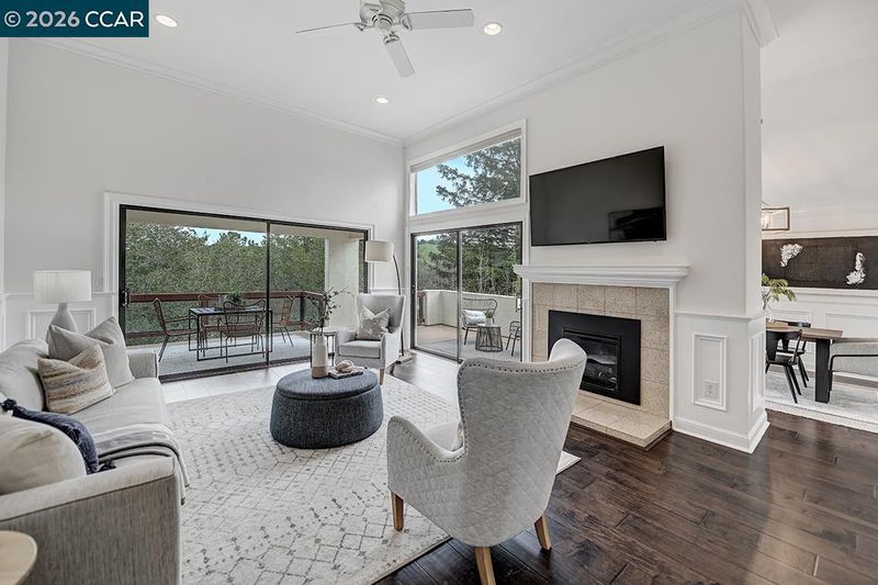 Tucked into a peaceful, tree-lined setting in Rossmoor, this sought-after Villa Verde model offers privacy, light, and style. Featuring 2 bedrooms, 2 baths, and a finished loft/den, the open floor plan is filled with natural light from oversized windows and tranquil hillside views. Enjoy seamless indoor-outdoor living on the expansive deck surrounded by mature trees—ideal for morning coffee, sunset wine, or entertaining guests. Designer touches include high ceilings, hardwood floors, new carpet, wainscoting, crown molding, and updated lighting and fixtures throughout. The eat-in kitchen features white cabinetry, granite countertops, a stainless refrigerator, white appliances, and plantation shutters framing serene views. The living room offers an electric fireplace and mounted flat-screen TV, creating a warm, inviting space to gather. The primary suite includes a walk-in closet and ensuite bath with soaking tub and double-sink vanity. The guest bedroom opens directly to the deck, perfect for visitors. A finished loft w/built-in desk, serviced by central H/A is ideal for a home office or flex space. In-home laundry & attached painted garage w/ epoxy floor complete this move-in-ready retreat.
