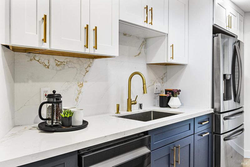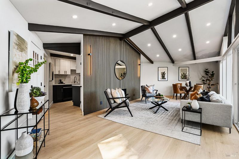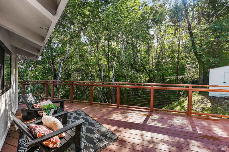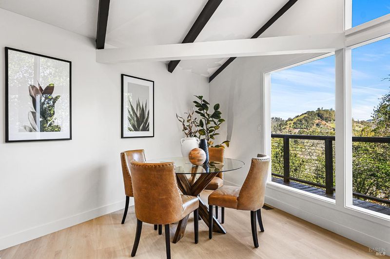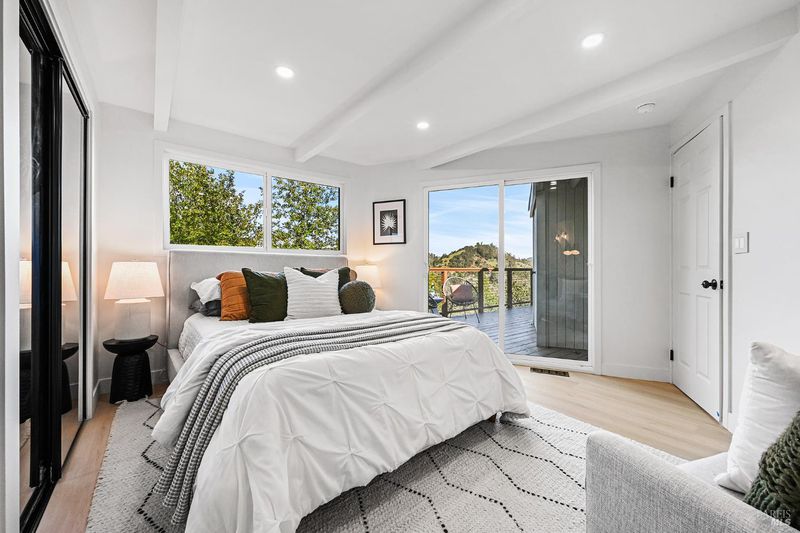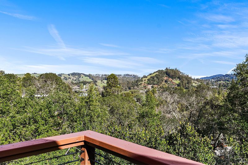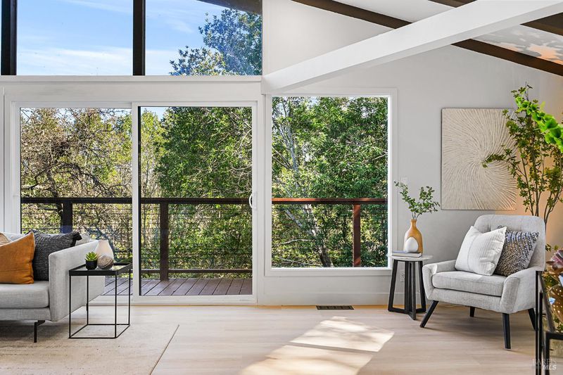 Set on a quiet hillside above San Anselmo, this light-filled home blends classic mid-century character with thoughtful modern updates. Vaulted ceilings and expansive windows create an open, airy feel while capturing natural light and surrounding hillside views. A sleek fireplace anchors the living room, offering a comfortable space for everyday living. The updated kitchen features quartz countertops, stainless steel appliances, and custom cabinetry, providing a streamlined and functional layout that flows easily into the main living area. A wraparound deck extends off the living space, offering an elevated setting to take in the outdoors and fresh Marin air. The bathroom has been refreshed with contemporary tilework and updated fixtures for a clean, modern finish. An outdoor storage shed adds practical space for tools, gear, or seasonal items. The property also includes a designated carport, a valuable feature in this hillside location. Just minutes from downtown San Anselmo's shops, dining, parks, and trail access, this move-in ready home offers privacy, natural light, and comfortable living in one of Marin's most desirable communities.