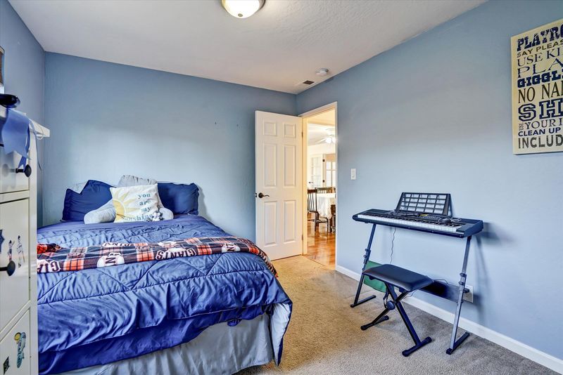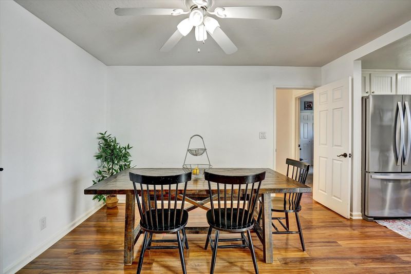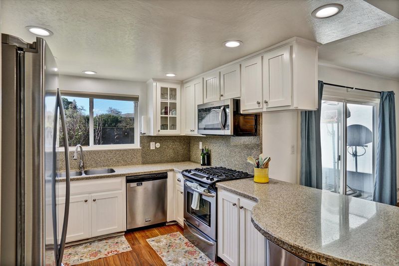 Take advantage of this rare opportunity to own a spacious single-story 4-bedroom townhome—the largest one-story floor plan available. The home offers an open great room with a combined kitchen, family room, and dining area, along with a separate living room. The updated kitchen features solid slab countertops, glass-front cabinets, and includes the refrigerator. Vaulted ceilings in the living room and primary bedroom create a bright, open atmosphere, while the three additional bedrooms are light-filled and generously sized. The hall bathroom includes a jacuzzi tub, and the home also features window shutters and laminate flooring throughout. Enjoy outdoor living on the patio and landscaped yard with no rear neighbors for added privacy. Energy-efficient upgrades include dual-pane windows and new attic insulation.