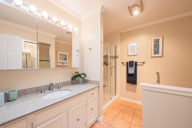 - Granite, Primary - Stall Shower(s), Primary - Tub with Jets, Skylight, Solid Surface, Stall Shower, Tile, Tub in Primary Bedroom