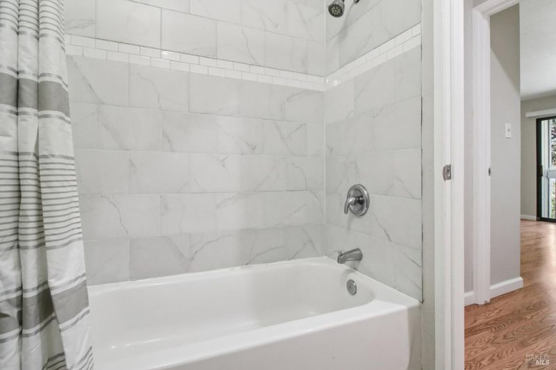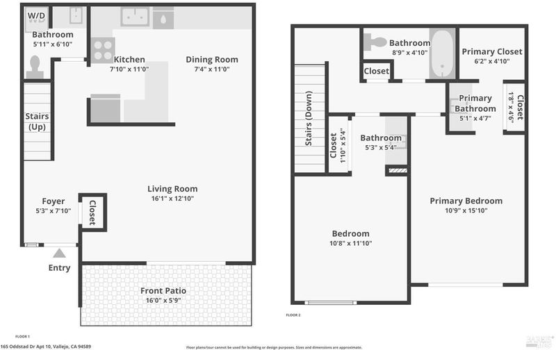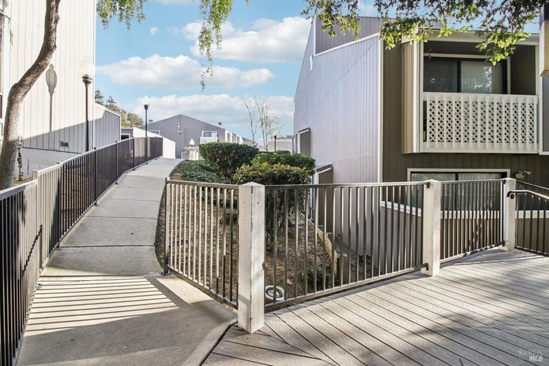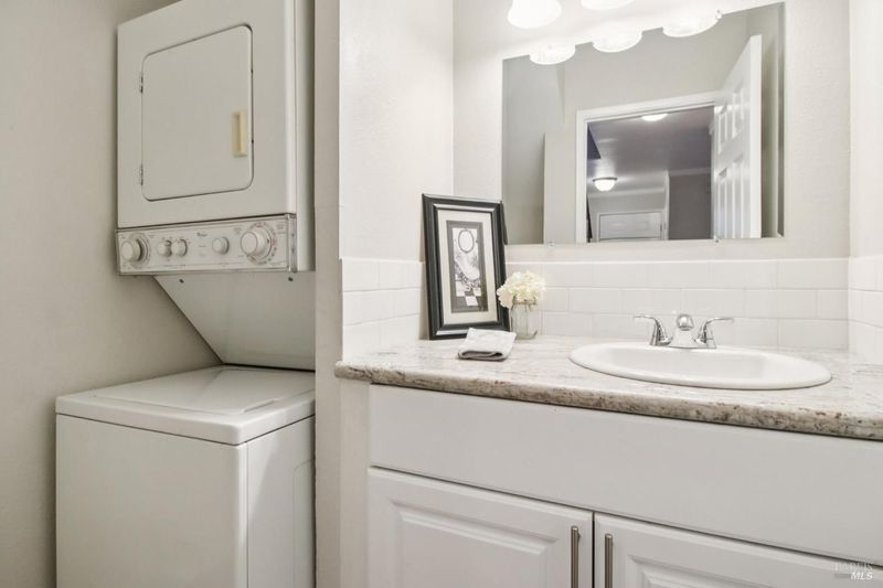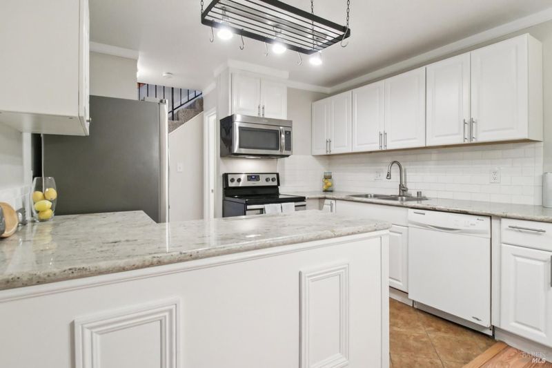 Welcome to this centrally located Vallejo townhouse offering comfort, functionality, and thoughtful updates. Freshly painted and updated, this inviting home features a well-designed kitchen that blends style and practicality Perfect for everyday living or entertaining. The kitchen offers light quartz countertops, crisp white cabinetry with modern hardware, a spacious breakfast bar, an overhead pot rack for easy access, and a large refrigerator. The open living and dining area is filled with natural light and opens through sliding glass doors to a cozy lower porch ideal for morning coffee or evening relaxation. A convenient half bath on the main level includes a stackable washer and dryer for added efficiency. New carpeting accents the staircase, while tile and laminate flooring flow throughout the rest of the home. Upstairs, you'll find two generously sized bedrooms, each with its own private vanity featuring white granite countertops and mirrored closet doors. The primary bedroom includes a walk-in closet and access to a private balcony, offering a peaceful retreat. Additional features include a one-car garage plus an assigned parking space, providing ease and convenience in this desirable location, quick access to freeways, shopping and Sutter Health & Kaiser Hospitals.