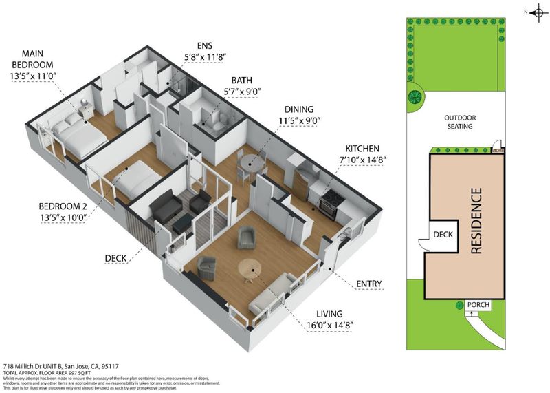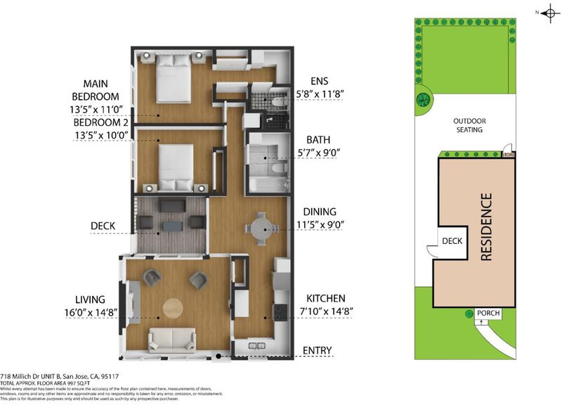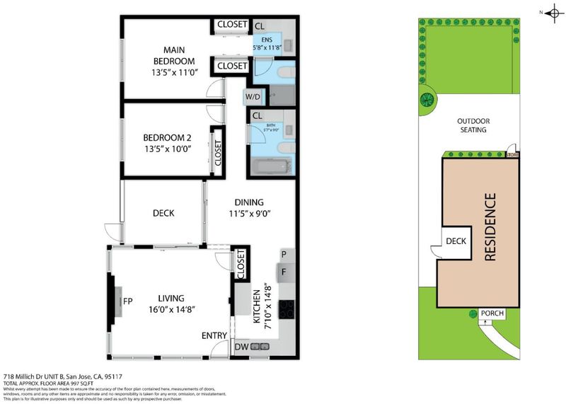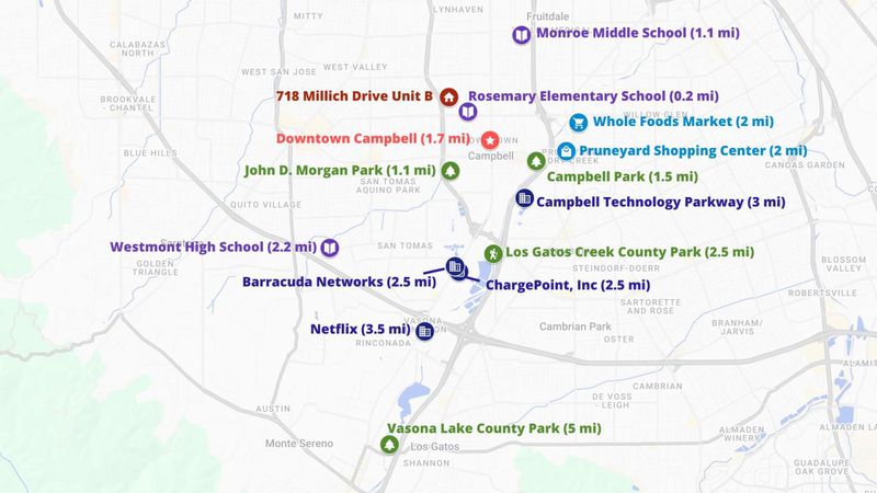 718 Millich Drive Unit B is single-level end-unit 2-bedroom 2-bath home offering 1,018 sq.ft. of living space in desirable Campbell location. Property is part of Valley Forge Condominium Association #1 HOA, community of 20 townhouse-style condominiums. Vaulted ceilings with exposed beams create openness while large sliding glass doors bring natural light into living and dining areas and open to private deck. Brick accent wall adds texture and a cozy fireplace serves as focal point in living room. Kitchen features granite countertops, oven range, microwave hood, dishwasher, garbage disposal, new refrigerator and ample cabinetry. Laminate flooring runs through main living areas complemented by tile in both bathrooms. Primary bedroom includes ensuite bathroom with shower stall and his-and-her closets. Second bedroom features built-in closet. Hall bathroom offers shower-tub combo. Bathrooms refreshed with new lighting, quartz countertops, undermount sinks and new faucets. In-unit washer and dryer add convenience. Outside backyard offers room to unwind with storage shed. Home includes one carport and additional storage area. Walking distance to shopping public transportation and parks. Easy access to San Tomas Expressway Hamilton Avenue and freeways 17 and 280.