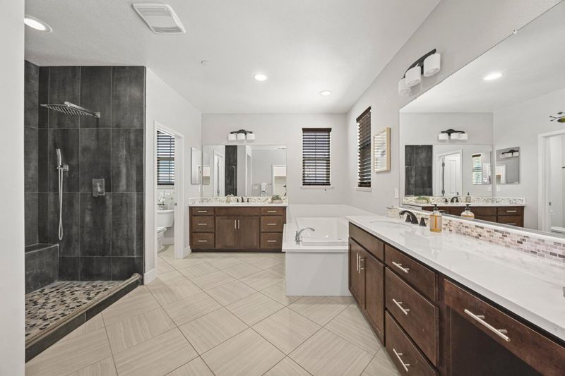 Double Sinks, Full on Ground Floor, Half on Ground Floor, Primary - Oversized Tub, Shower over Tub - 1, Stone, Tile, Tub in Primary Bedroom