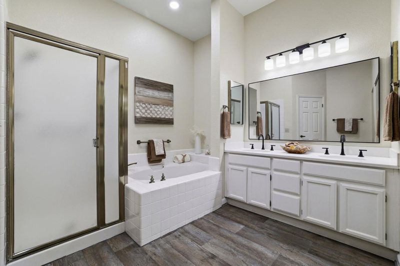 - Double Sinks, Primary - Oversized Tub, Primary - Stall Shower(s), Shower and Tub, Solid Surface