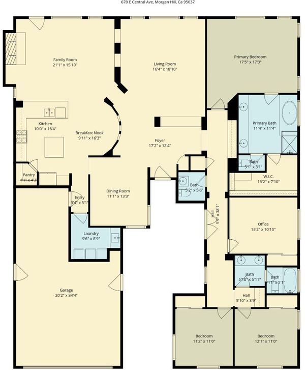 This elegant California-style single-story residence offers a rare combination of comfy spaces, elegance, and airy vibes. Built in 2005, the home features four bedrooms, two and one-half bathrooms in approximately 2,727 square feet well-appointed living space on approximately 7,811 square foot lot. High ceilings, shutters throughout, and expansive floor plan. The open kitchen with breakfast nook and bar seating flows seamlessly into the family room with fireplace, ideal for both everyday living and entertaining. A formal dining room and separate living room provide versatility and a more tailored living experience. Integrated speakers throughout the home enhances the joyful ambiance. Other features include central heating/air conditioning, new attic insulation with ample attic storage, dedicated laundry room with a sink, and a deep attached two-car garage. The stucco exterior and tile roof reflect timeless California style, with low-maintenance landscaping and a peaceful back patio area. Close to highly rated El Toro Elementary School, in the Ann Sobrato High School area, and close to upscale shopping and popular downtown Morgan Hill restaurants, this home delivers refined single-story living in a highly desirable location.