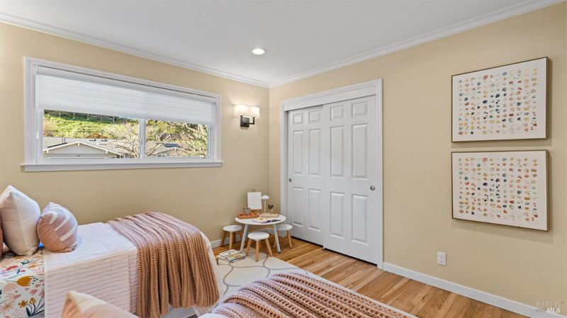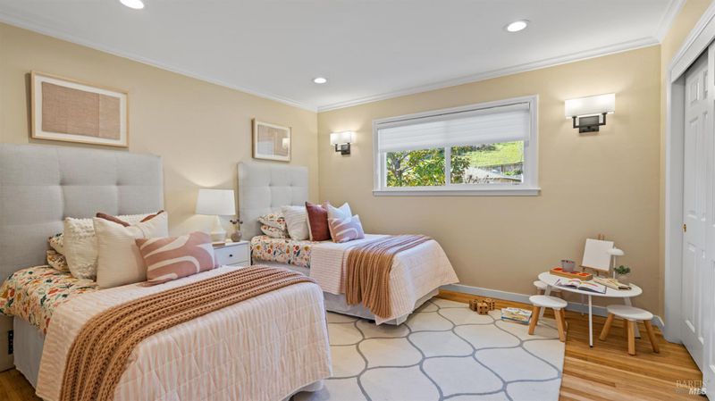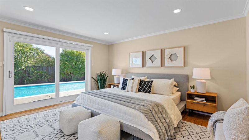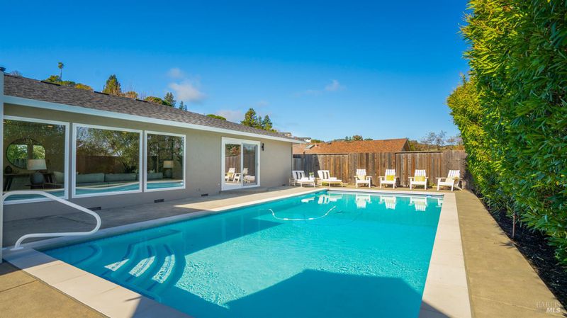 Thoughtfully designed and updated single level home with sparkling pool in Terra Linda. This stunning 1898 s.f. Kenney Atherton model features floor to ceiling windows and skylights that flood the home with natural light. The refined landscaped front yard showcases the sleek concrete walkway leading up to the welcoming porch with sitting area. Inside, formal living and dining rooms flow seamlessly into a warm family room with fireplace, overlooking the backyard and the hills beyond. A remodeled kitchen offers stainless steel appliances, quartz countertops, a farmhouse sink, and opens to a separate breakfast room addition with a dining bar, perfect for casual meals or gathering while cooking. Three spacious bedrooms include a private primary suite with a sun-filled stall shower bath, walk-in closet, and slider providing direct access to your poolside retreat. The backyard is a peaceful escape, featuring a newly renovated pool with automatic cover and ultra-modern hardscape, ideal for relaxing or entertaining. Over $300k was invested in the recent renovation of the pool, hardscape and professional landscaping! Amenities include oak hardwood floors in the bedrooms, new luxury vinyl plank flooring throughout the main living areas, central heating and air conditioning, a tankless water heater, a louvered pergola for year-round outdoor living, a two-car garage, and a three-car driveway. Conveniently located in the Miller Creek School District near Scotty's Market, the Terra Linda Community Center and Pool, and Northgate shopping. Ready to move right in and enjoy for a lifetime.