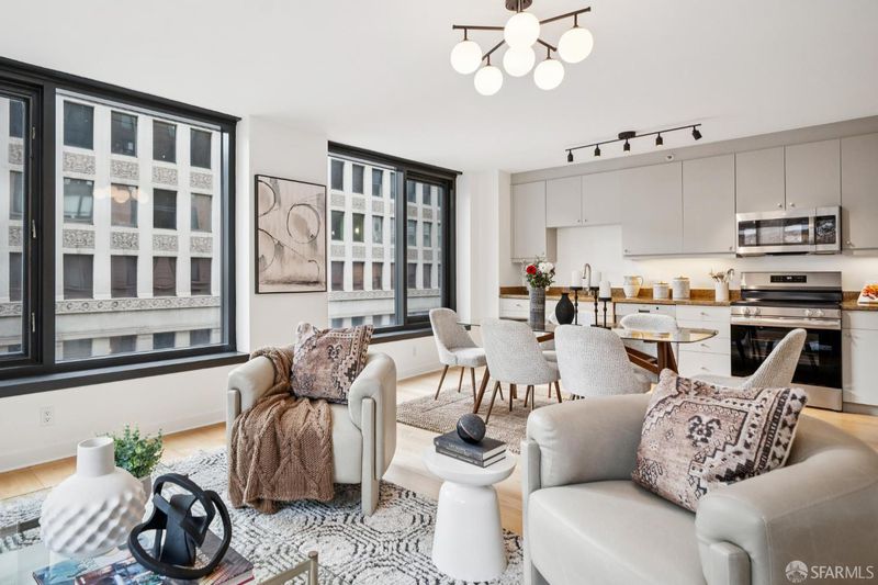 Enjoy the best of city living in this polished two bedroom, two bath condo in one of San Francisco's most vibrant and culturally rich neighborhoods, where Yerba Buena, SoMa, and the Financial District converge. Oriented to the south and west, the unit is bathed in natural light throughout the day, with sizable windows framing city and treetop views from the home's coveted corner position. An inviting foyer welcomes you with generous closet space and in-unit laundry. Beyond it, the open kitchen, dining, and living areas flow together naturally, a spacious and inviting layout, ideal for entertaining. As the sun sets, city light views bring the space to life in an entirely different way. A thoughtful split-bedroom floor plan offers both privacy and versatility. A generous primary bedroom complete with an ensuite bath on one side, and a well-proportioned second bedroom and full bath on the other, perfect for guests, a home office, or flexible everyday living. Whether you're a first-time buyer, seeking a chic pied-a-terre, or adding to your investment portfolio, unit 402 delivers. This turnkey home home has been recently been updated with new paint, lighting and new carpet in the bedrooms. The full-service building offers 24-hour door staff, secure entry, designated garage parking, multiple elevators, and an elegant lobby. Above it all, a rooftop deck showcases panoramic city views w/ barbecues, a fire pit and loungers. With renewed weekday energy as companies and creatives return to the neighborhood, there's an undeniable momentum that makes city living feel exciting again. Hip coffee houses, celebrated restaurants, and cocktail bars are just outside your door, while retail and luxury boutiques, public gardens and galleries invite leisurely afternoons. A short stroll brings you to the Embarcadero and the iconic Ferry Building, with its farmers' markets, artisan merchants, and iconic bay views. BART, Muni, Caltrain, tech shuttles, and major freeways are all within easy reach, this home keeps you effortlessly connected to the very best of San Francisco and the Bay.
