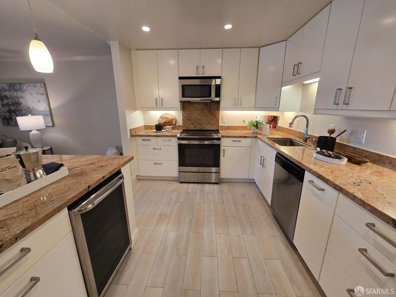 Welcome Home! This spacious 1,286 sq ft residence offers 2 bedrooms, 2 updated baths, and an open-plan layout with ample windows that bring in an abundance of light and tranquil views. The updated, open-plan kitchen opens to the spacious living and dining areas and large patio, providing an ideal entertaining environment. The kitchen includes under-counter lights, tile flooring, and contemporary appliances plus a wine refrigerator. The unit includes in-unit laundry, a convenient full guest bathroom, and new carpet and paint throughout. The primary bedroom features multiple closets, windowed alcove, and ensuite bath with walk-in shower. Uniquely, this unit has two deeded garage parking spaces (30/31) immediately adjacent to the elevator, allowing one to avoid stairs. An additional deeded storage room is located just down the hall. The community delivers an impressive array of amenities alongside the Bay Backwater Trail, including a heated pool and spa, BBQ and picnic and event areas, tennis and bocce ball courts, basketball court, kids play area, par course, vehicle parking, RV parking, a car wash station, and beautifully maintained landscaping. Residents enjoy peaceful walking paths, lush greenery, and a strong sense of privacy, all while being minutes from top schools (San Mateo-Foster City School District), parks, recreation trails, local shopping, and easy commute.