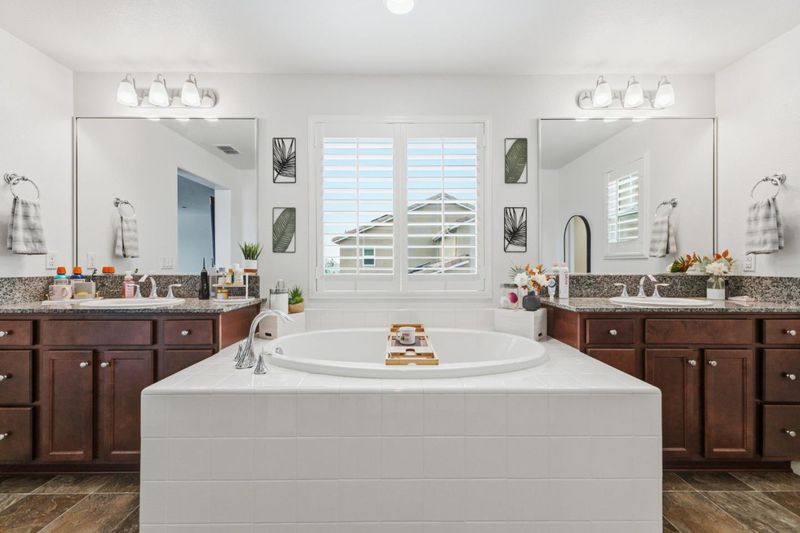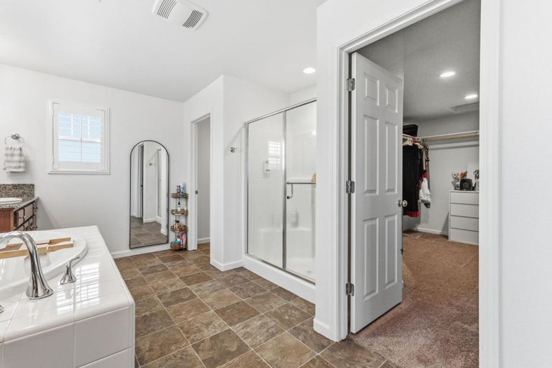 Double Sinks, Full on Ground Floor, Primary - Oversized Tub, Primary - Stall Shower(s), Stall Shower - 2+, Tile, Tub in Primary Bedroom