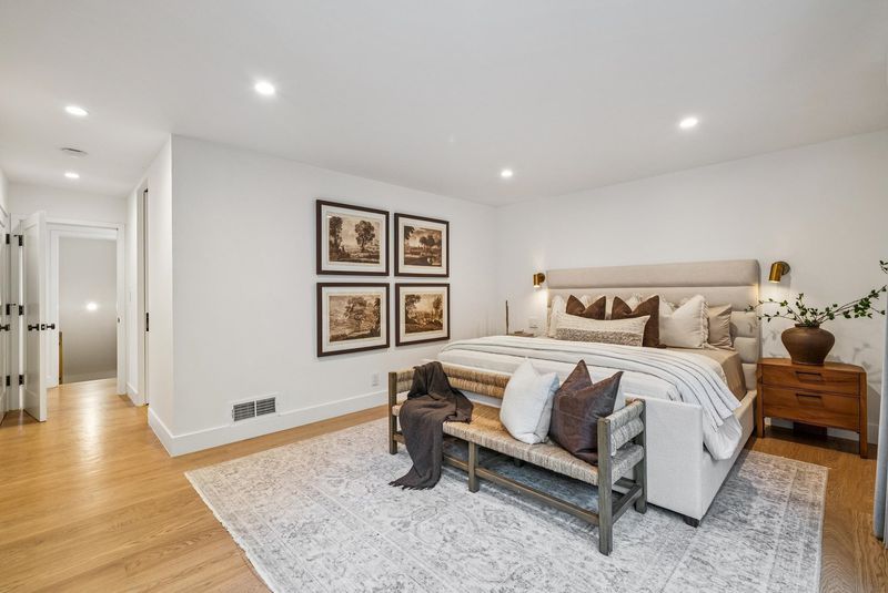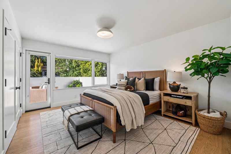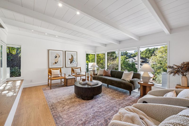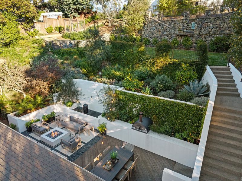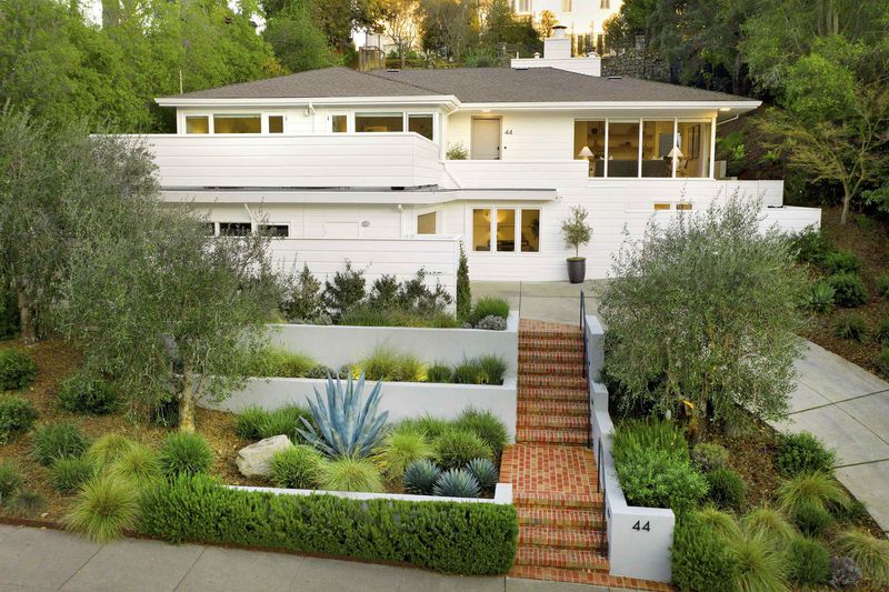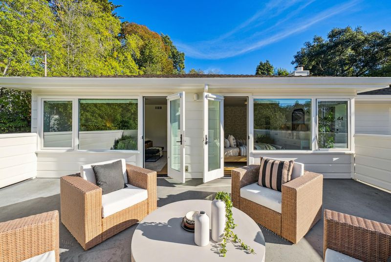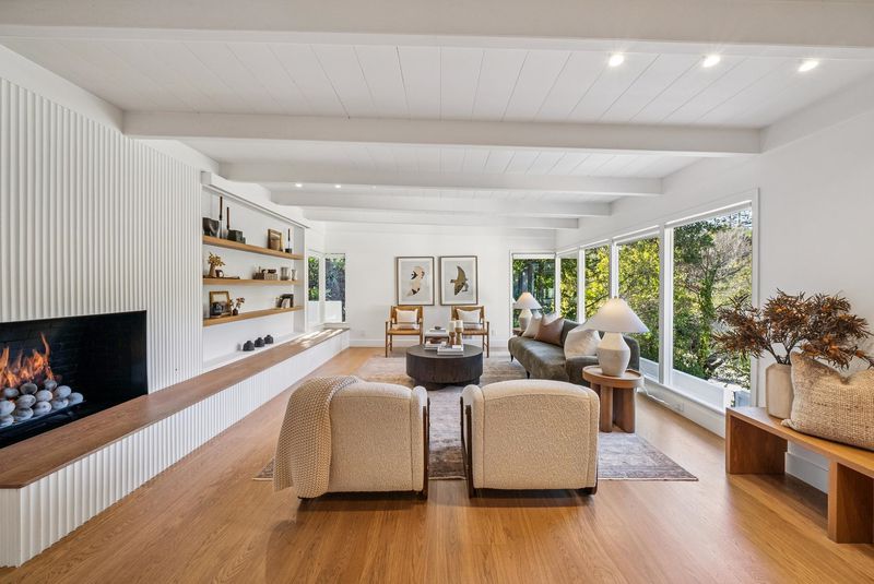 Meticulously updated, 44 La Salle offers a refined take on midcentury modern design. Sunlight pours through floor-to-ceiling windows, highlighting crisp lines & warm, natural finishes. A sleek fireplace w/custom fluted wood paneling anchors the living room, creating an inviting & elegant atmosphere. The chef’s kitchen features a large island, Carrara marble countertops & Thermador appliances, seamlessly connecting to the dining area & a dramatic wall of sliding glass doors out to the serene rear patio w/seating area, gas fire pit wood-burning pizza oven & tranquil fountain, designed for effortless indoor-outdoor living. Set on ~ 1/3 acre, the expansive grounds are ideal for play or entertaining, w/mature olive trees imported from Italy thoughtfully woven throughout, enhancing the home’s natural beauty. On the main level, 2 light-filled BRs open onto a large deck & share a beautifully appointed full bath. The primary suite offers direct access to the patio & features a luxurious en suite bath w/heated floors.